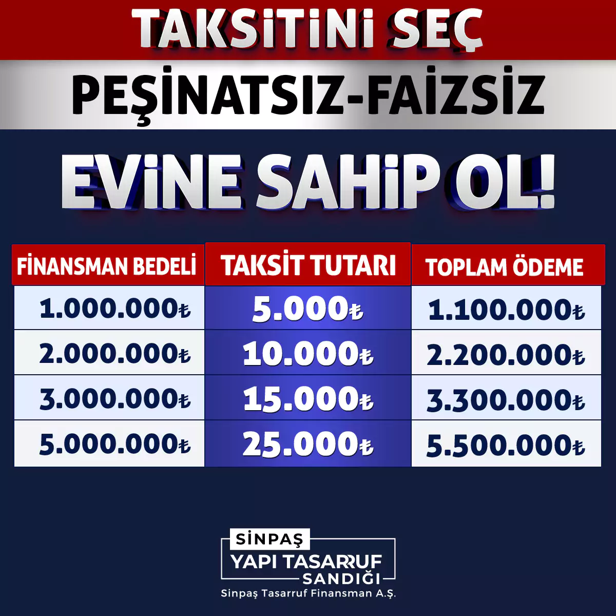 Sinpaş Yapı Tasarruf Sandığı ile istediğiniz eve ulaşmak çok kolay! Taksitinizi seçin, size uygun esnek ve uygun ödeme planlarıyla bütçenizi zorlamadan ev sahibi olmanın ayrıcalığını yaşayın.